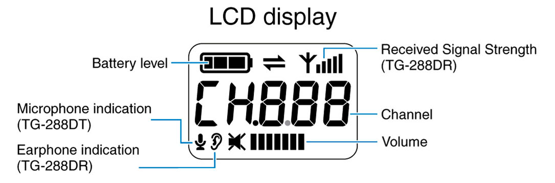 TG-288DT transmitter has a built-in microphone, one external microphone-level headset input (3.5mm) and one auxiliary-level input (3.5mm).